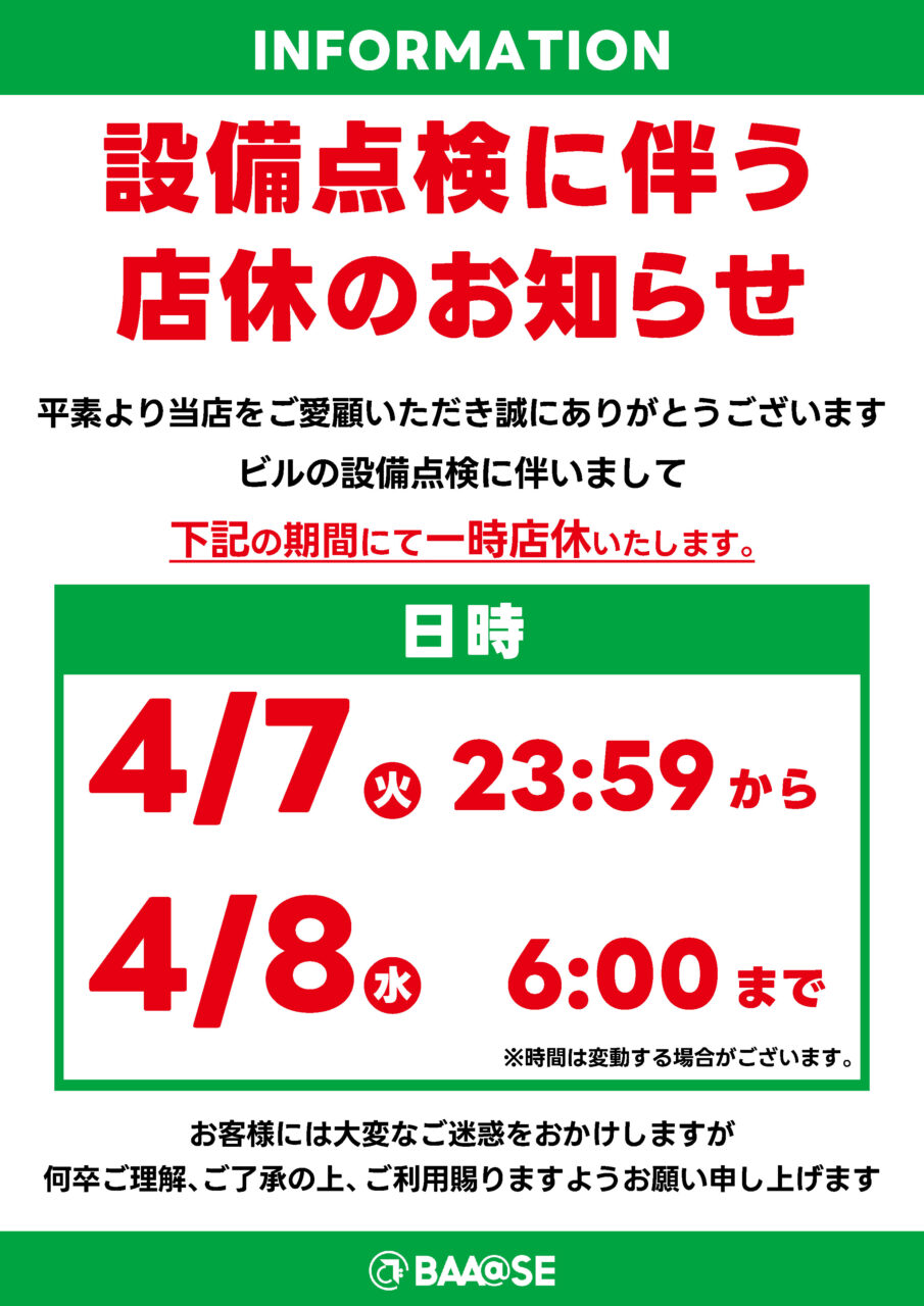 【川崎銀柳本館】一時店休のお知らせ